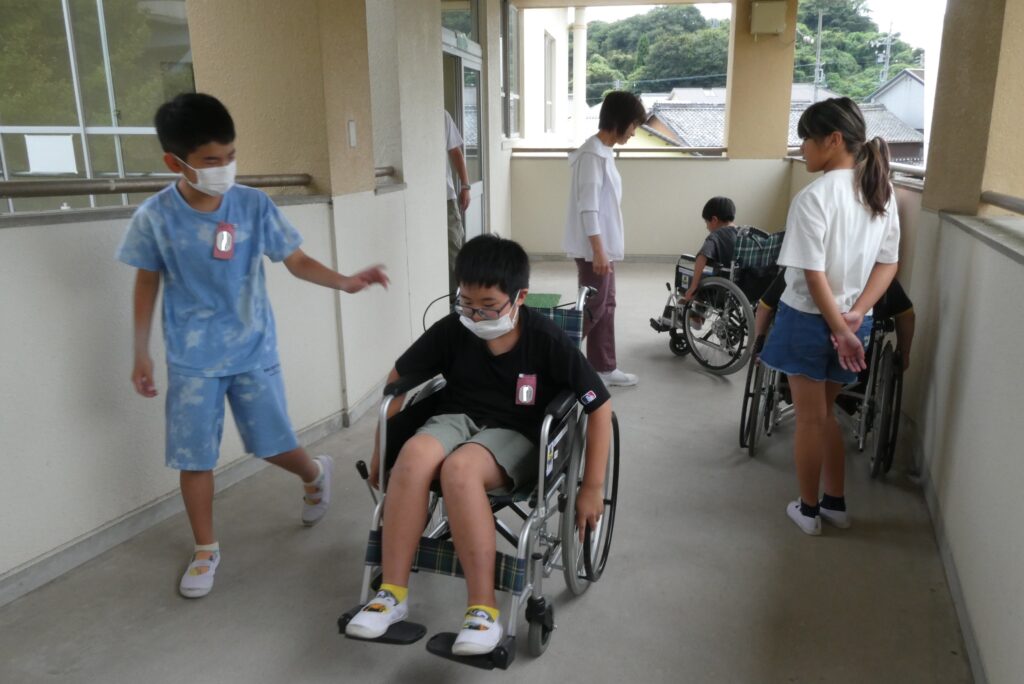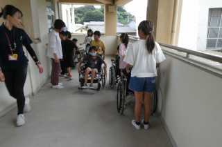 今日は社会福祉協議会の方にご協力をいただき、4年生で福祉実践教室を開き車いすやボッチャに挑戦しました。初めて車いすを体験する子どもたちは「思ったより力がいる」「段差があるとのぼれない」などの感想をもちました。また、どのように声をかけサポートするとよいかなどを学びました。