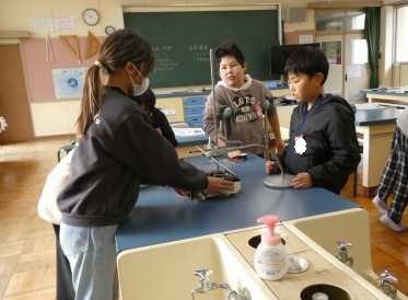 今日は4年生が初めてガスバーナーを使った実験を行っていました。けがをしないように充分注意しながら進めていましたが、やはり実際に火がつくと驚いたり、どきどきしている様子でした。教科書を読むだけではなく、実際に扱ってみることでより知識が深まっていくようでした。