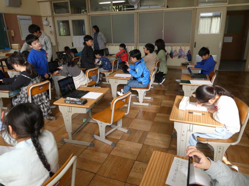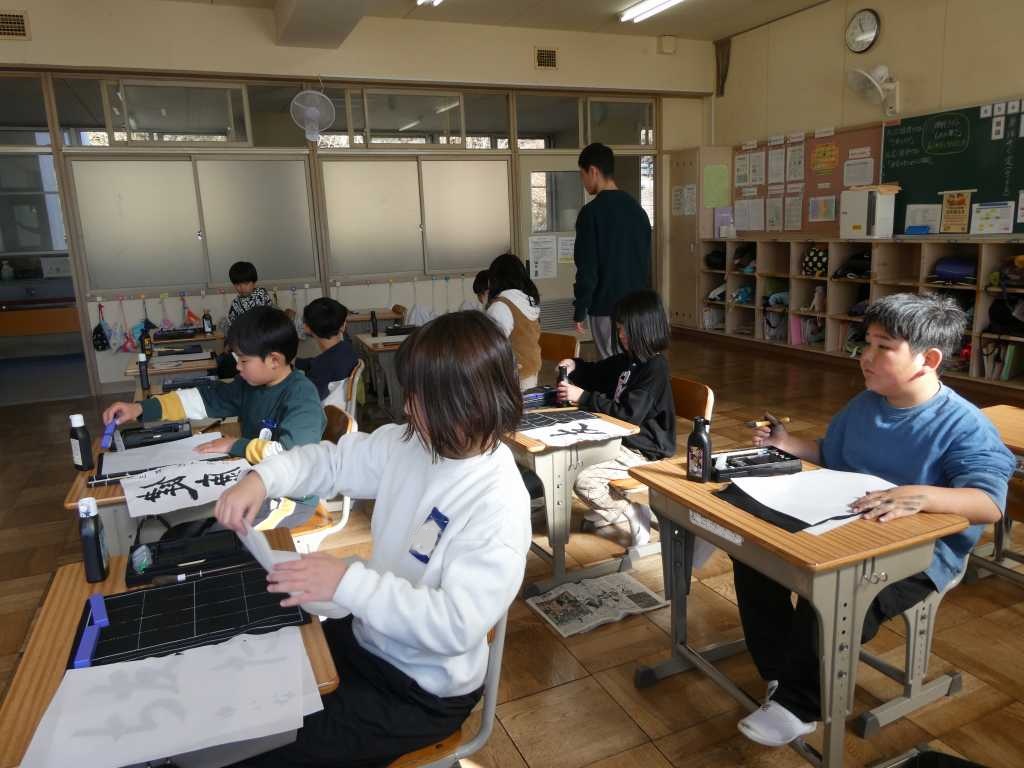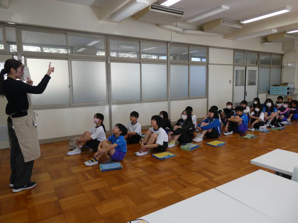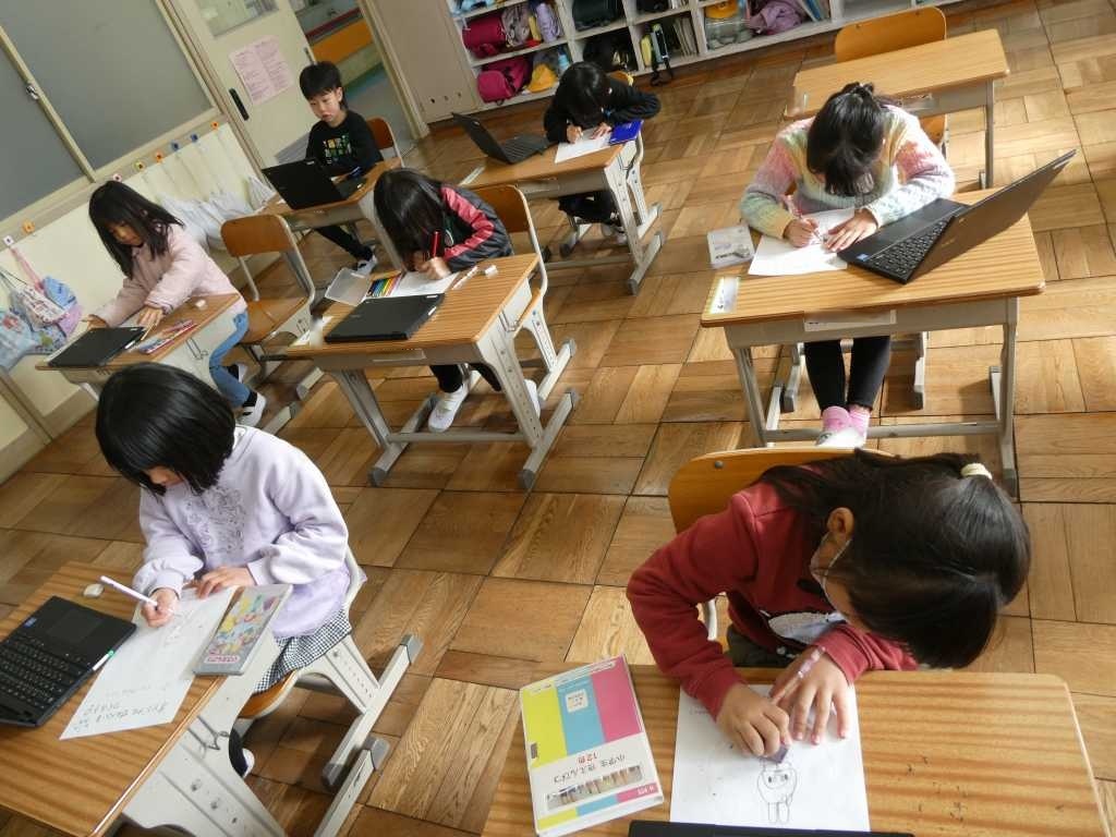 今日は1・2年生対象に地域の「山三商会」から宮原講師を迎え「オリジナルせんべいを作ろう」と題し、せんべい作りの話を聞き、せんべいにプリントしていただく絵を子どもたち一人一人が考え描きました。どんな仕上がりになるのか、みんなわくわくしています。
