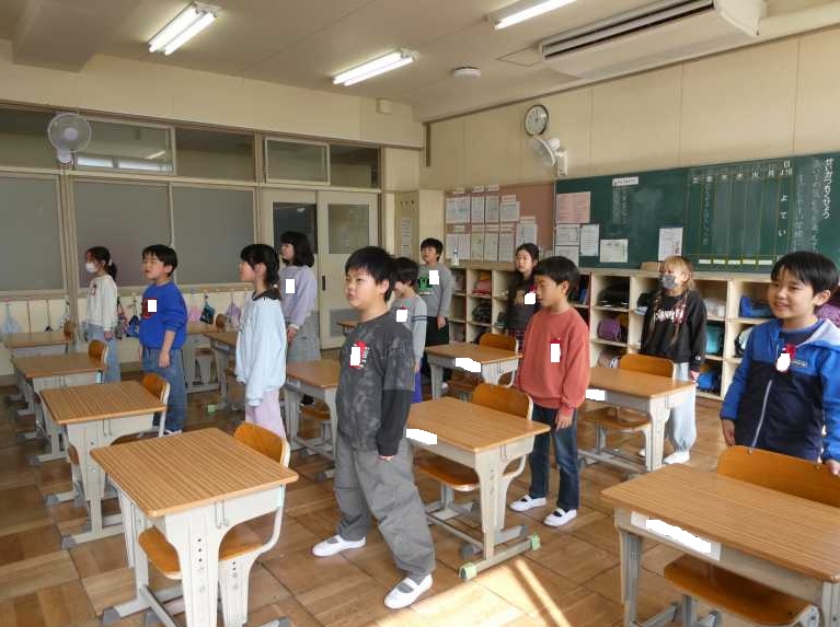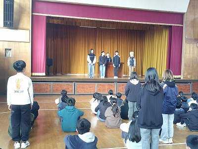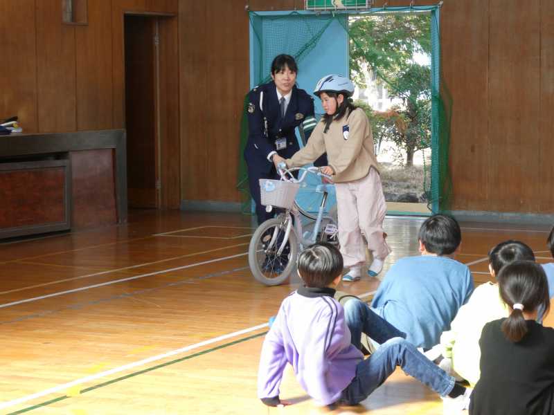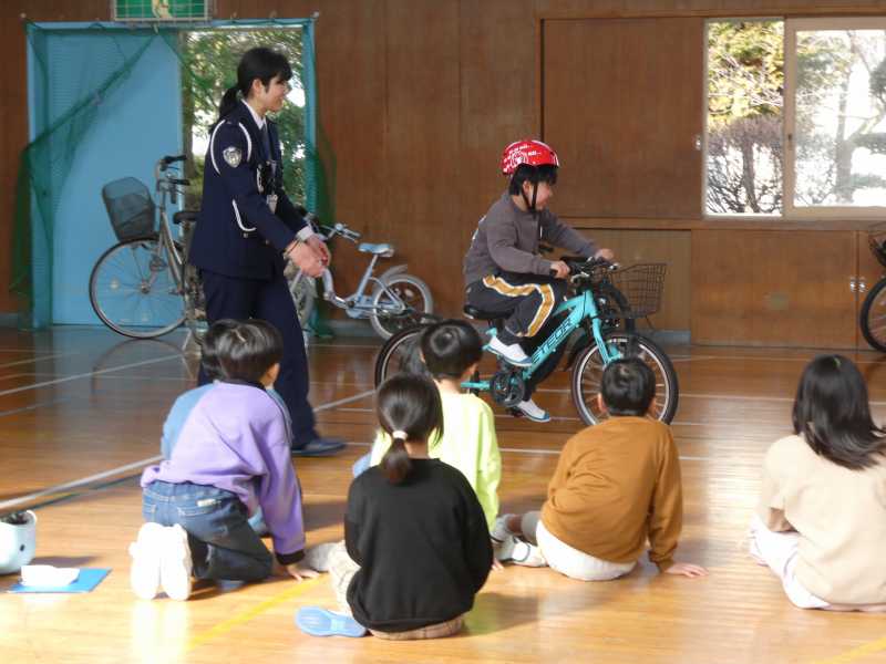 今日は、警察署の方に来ていただき交通安全教室を開きました。主に、自転車の正しい乗り方や交通ルールについて教えていただきました。暖かくなってくると自転車にのって公園などに出掛ける機会も増えるかもしれません。交通ルールを守って安全運転をしましょう。また、朝会では来年度の児童会役員の任命や体力章の表彰を行いました。