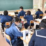 教室に入るとき誰もいないと思うほど静かでした。 教科書やノートを真剣に眺めています。 と、配られた学習プリント...