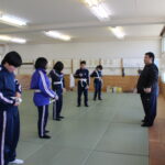 篠島中学校は柔道場が校舎内にあります。畳の部屋でまずは柔道着の着方から。