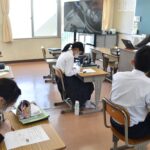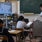 篠島について知っていることを学習プリントに書いています。 その後、近くの生徒同士で共有しています。
