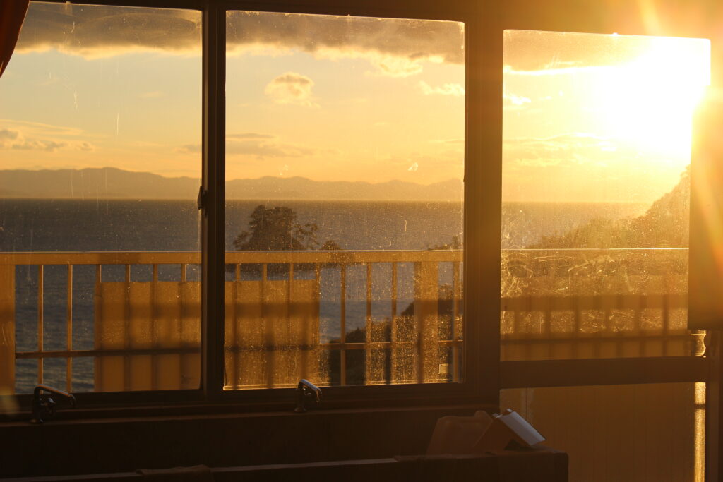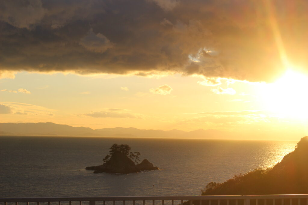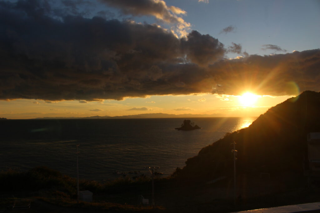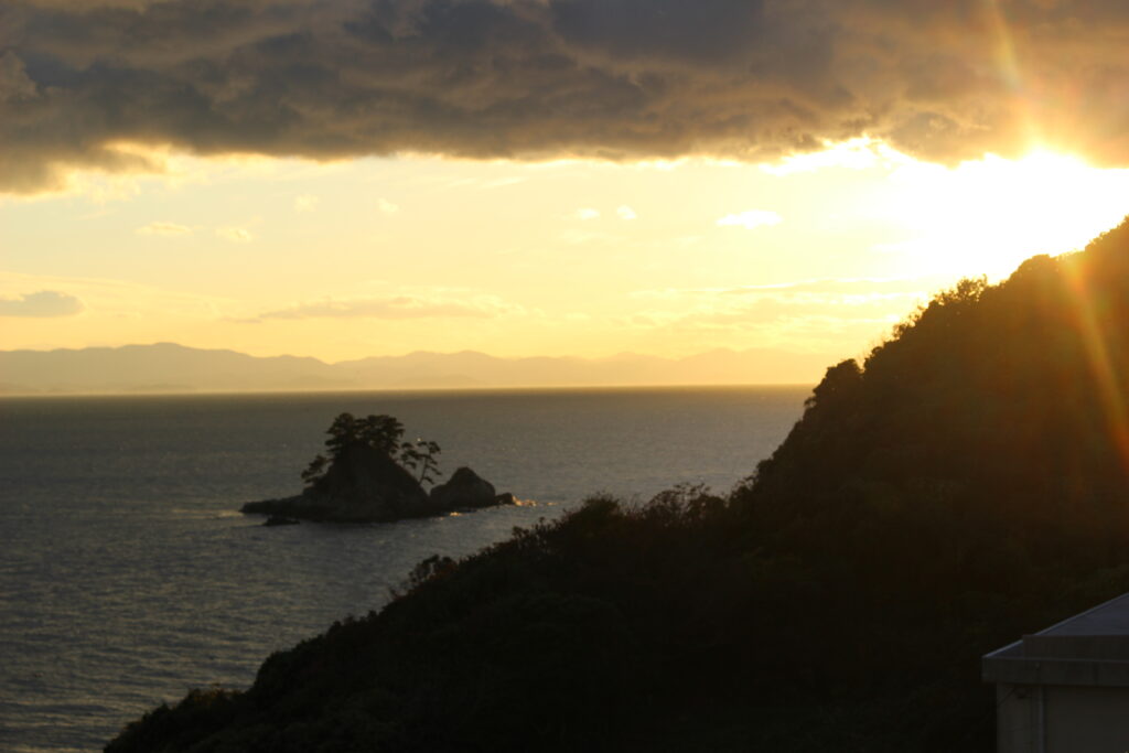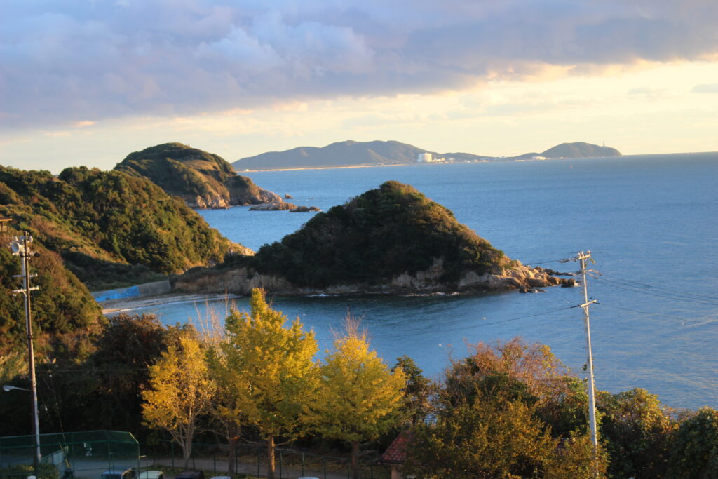 1204 夕暮れ時の篠島 2025/12/4 学校 4階1年生教室から眺める夕暮れです。煌々と輝いて美しいです。何と言っても教室から見えるのがすばらしい。 そのまま屋上に上がり、撮りました。 今日は寒くて空気が澄んでいます。 三河方面もくっきりです。見とれてしまいました。 嗚呼、絶景かな・・・