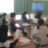 5年生の教室では,理科の「花のつくり」を学習していました。おしべやめしべの役割を確認して顕微鏡で観察します。顕微鏡の世界はミクロで,目には見えない物が拡大されるとあって,興奮しますね。