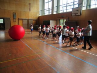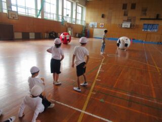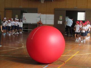 それぞれの種目の入退場の仕方やスタート前とゴール後の動きについて確認した後、赤白チームごとに「大玉ごろごろ」の練習をしました。事前に子どもたち同士で作戦を立てていたらしく、コーンの回り方など、個々に意見交換している姿もありました。