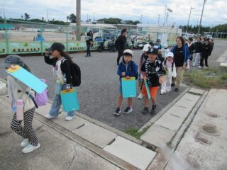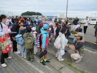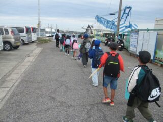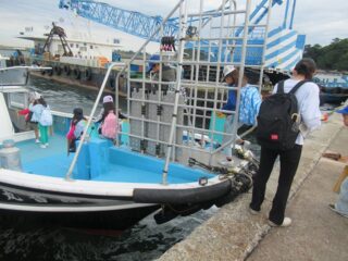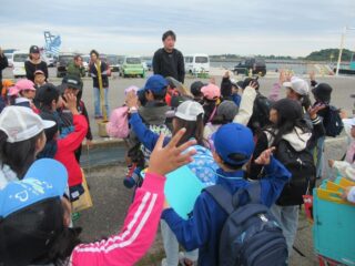 天気はあいにくの曇り。気温が急に下がり、肌寒さを感じるほどです。さらに篠島港は強風で、震えるほど寒かったですが、子どもたちは元気に出発していきました。