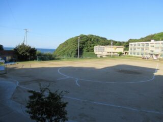 今日は運動会当日です。空も海も青く、とても気持ちのよい篠島の朝。子どもたちは足取りも軽く登校しました。