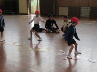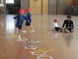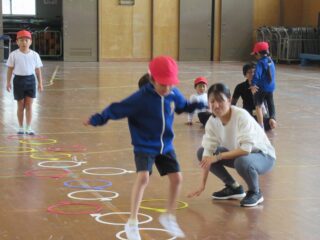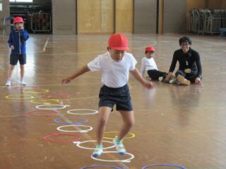 10/31 1年生 体育「走・跳の運動遊び」 2025/10/31 学校活動の様子 体育館で「とびあそび」をしました。その場で、いろいろな体勢でジャンプしたり、床に並べたフラフープに合わせて、ケンケンパー跳びをしたりしました。 リズムよく、軽やかに跳べていて、楽しそうでした。