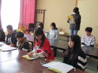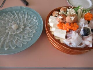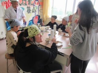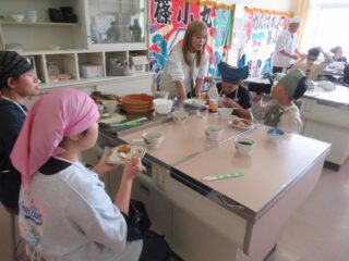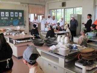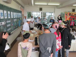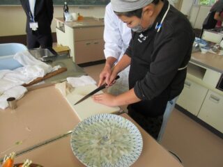 学校に戻ってから調理実習を行いました。柵にしたフグをフグ引き包丁をお借りして、フグ刺しにしていきました。野菜も切ってフグ鍋の準備も整えました。それ以外にも、観光協会の皆様がフグの唐揚げを作ってくださいました。学校では生で食するわけにいかないので、作ったフグ刺しはフグしゃぶにしていただきました。