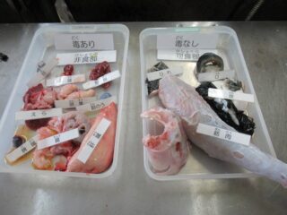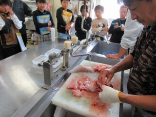 次に、ホテルの調理場でフグ捌きを見学させていただきました。熟練の調理師さんが、手際よく可食部とフグ毒のある非食部に分けていく様子を、感嘆の眼差しで見つめていました。フグの臓器の名称や働きも解説してくださり、魚の体の仕組みの学習にもつながりました。