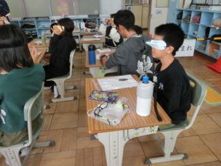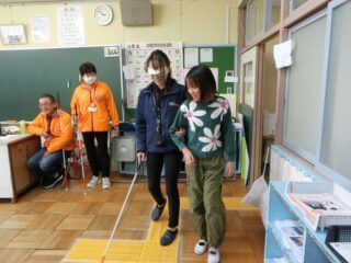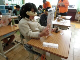 11/12 4年生 福祉実践教室 2025/11/13 学校活動の様子 今回のテーマは視覚障害についてです。視覚障害を疑似体験するためのゴーグルを装着して見え方を知ったり、点字ブロックの感触を確かめたり、適切な歩行の介助の仕方を学んだりしました。