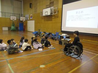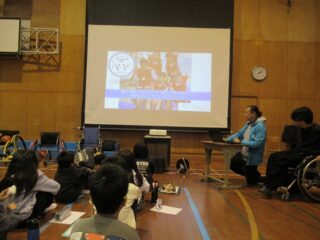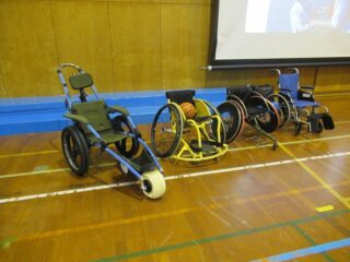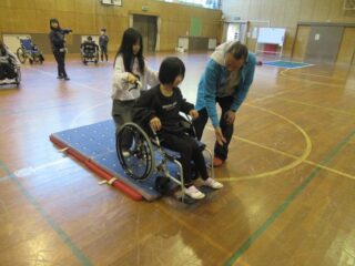 今回のテーマは、車椅子です。南知多町社会福祉協議会の方が、フェリーを使ってさまざまなタイプの車椅子を運んできてくださいました。車椅子の利用者の立場からの感じ方、考えを教えていただくとともに、実際に車椅子に乗る体験や補助をする体験を通して、今後、自分が行うべきことや意識すべきことについて考えました。