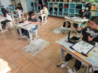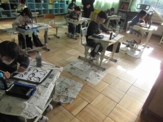 12/9 4年生 しのじまカルタの視写 2025/12/9 学校活動の様子 毛筆で「しのじまカルタ」の視写をしていました。これまでに学んだ筆の使い方を、字だけでなく絵にも応用しようというわけです。線の細さ、太さ、勢いを使い分けながら、視写をしていました。いつもよりも肩の力が抜けて、のびのびとかけているようでした。