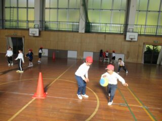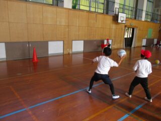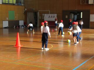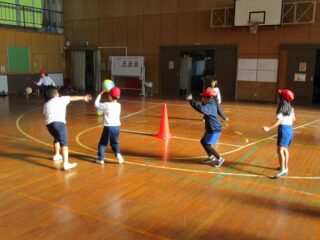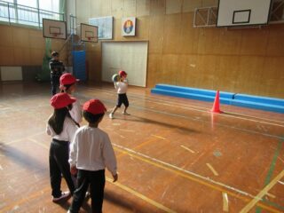 12/12 1・2年生 体育「ゲーム(ボールゲーム)」 2025/12/12 学校活動の様子 体育館でボールをカラーコーンの的に投げて当てるゲームをしました。ドリブルやパスをして的に近付き、カラーコーンめがけてボールを投げていました。グループによっては、的に当てさせないように守備をつけているところもあり、楽しくも白熱した攻防を見せていました。