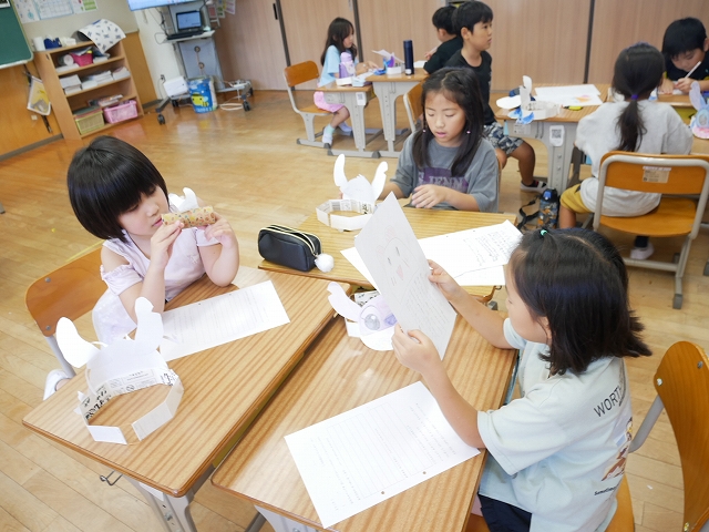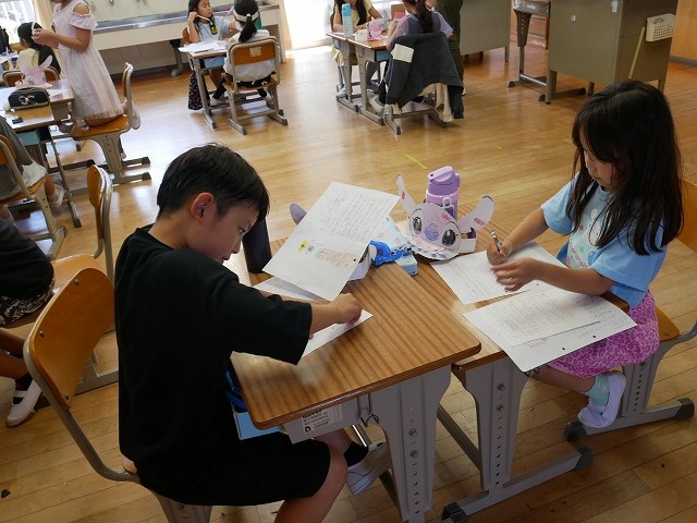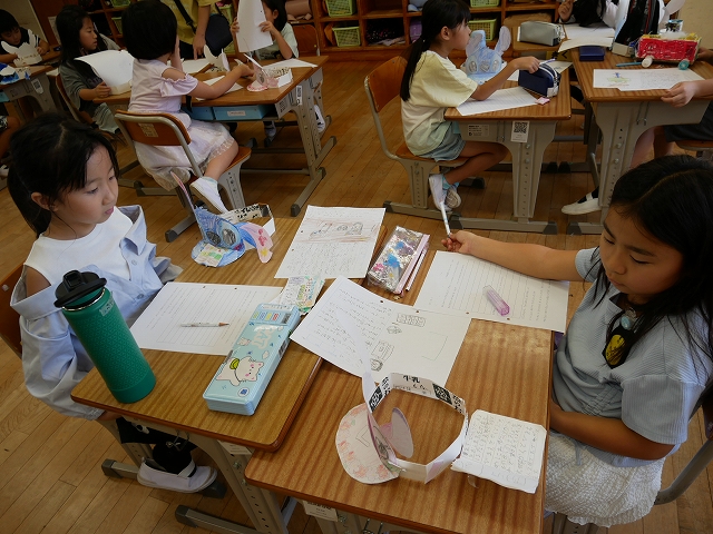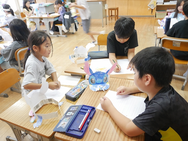 2年生は、グループでおもちゃの遊び方の説明を考えていました。