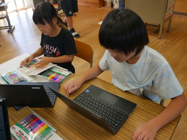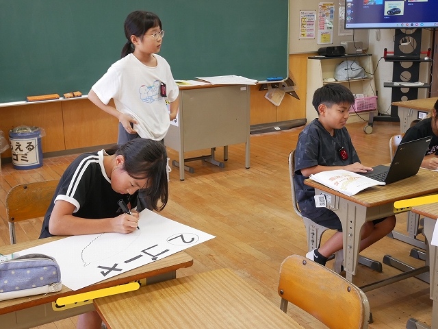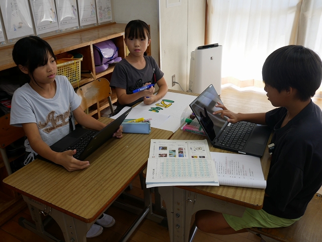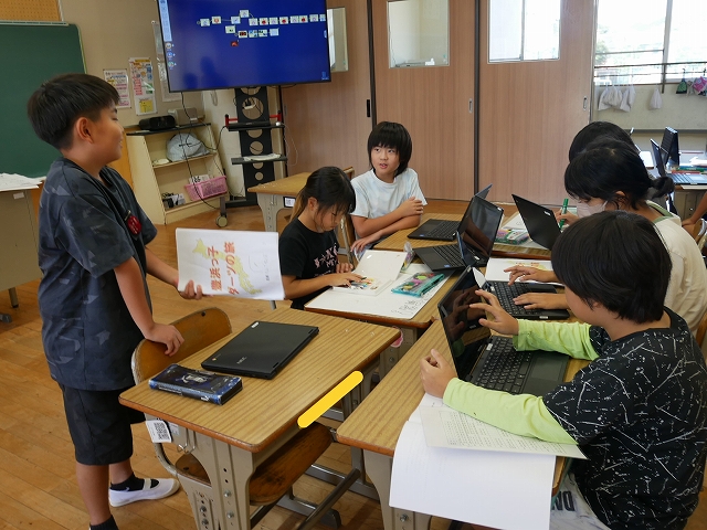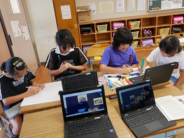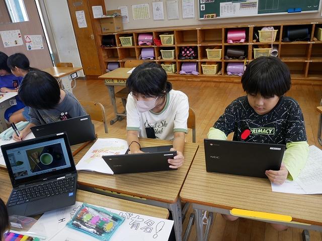 4年生は、都道府県について調べたことをタブレット端末や画用紙にまとめていました。