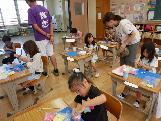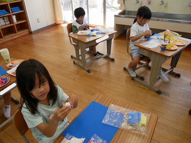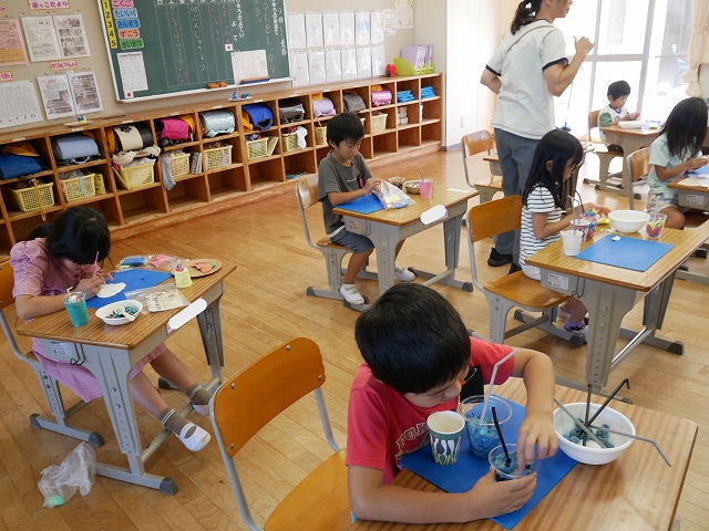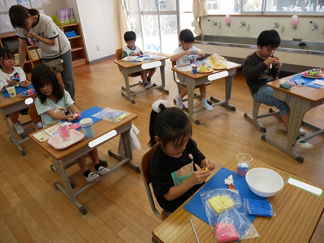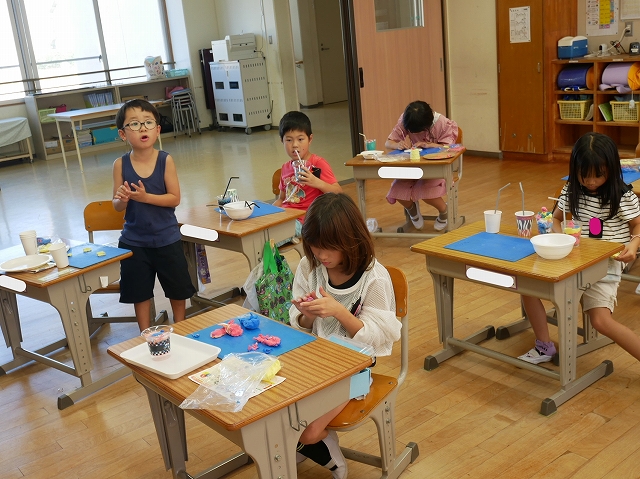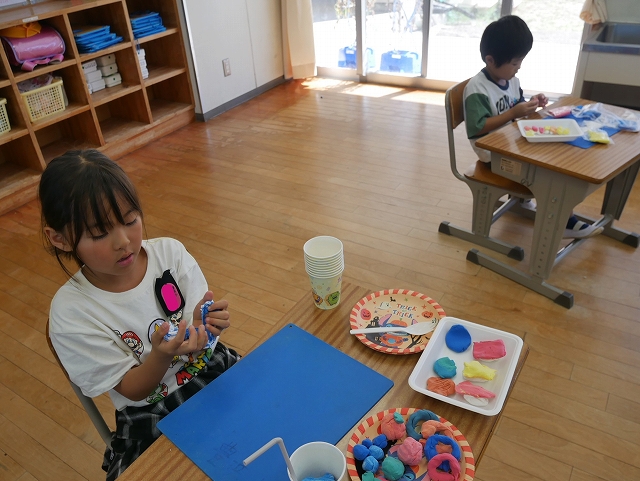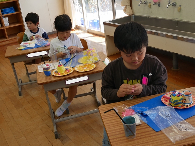 1年生は、図工の時間に赤、青、黄、白の粘土を使ってごちそうを作っていました。とても楽しそうに粘土をこねて形を作ったり粘土を混ぜて新しい色を作ったりして紙皿や紙コップ、プラスチックのコップやどんぶりに盛り付けていきました。とってもおいしそうなお寿司やデザート、ドリンクなどができました。