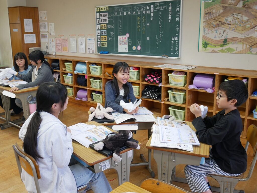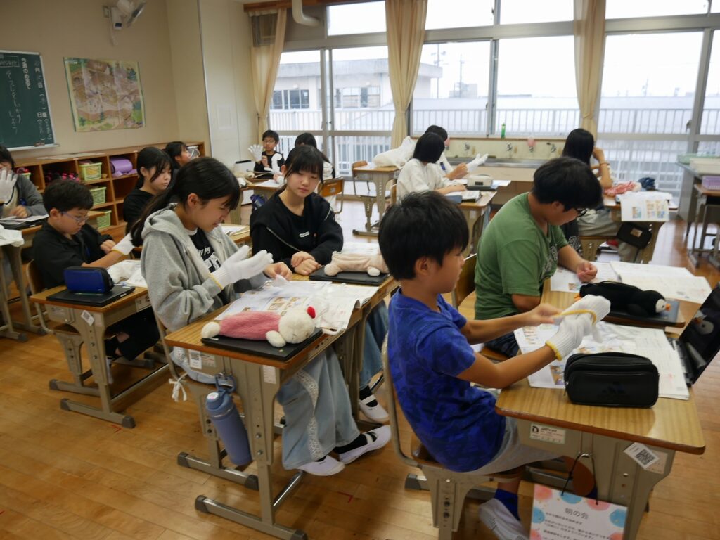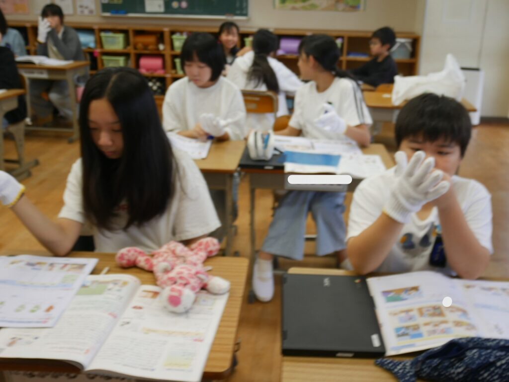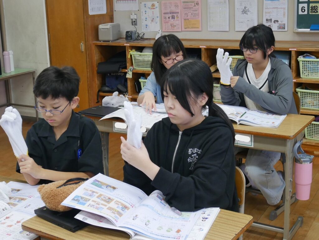 6年生は、家庭科の時間に季節の変化に合わせた衣服の着方について学習していました。寒い季節に快適に過ごす工夫を考えていました。重ね着の効果を確かめるために、手袋(軍手)1枚と2枚重ね、さらにその上にビニル手袋をかぶせてみて、温かさを比べていました。