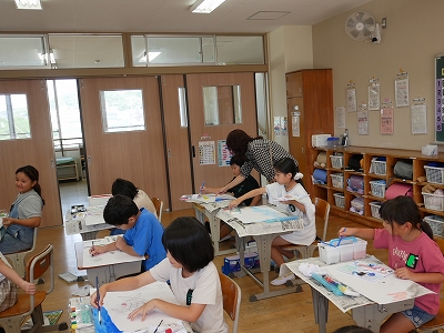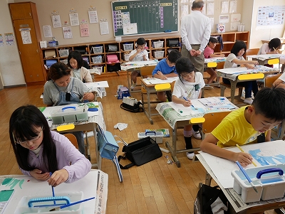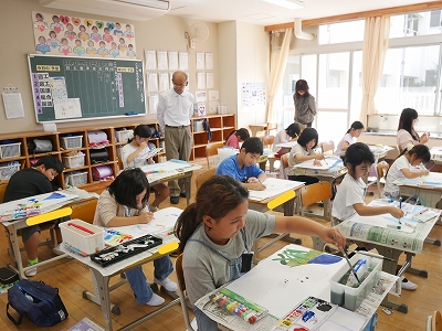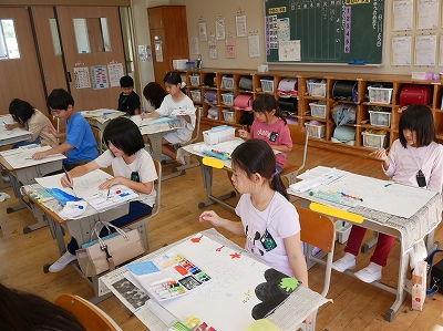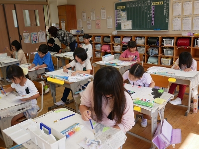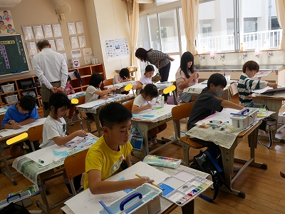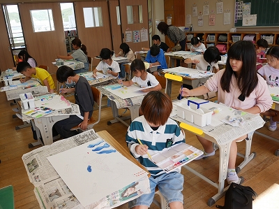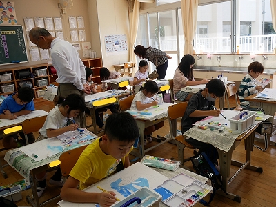 3年生は、図工の時間に読書感想画に取り組んでいました。「にじいろのさかな」という絵本から様子を思い浮かべて、絵に表現します。1時間目に画用紙に下描きをしていましたが、2時間目にはもう色をつけ始めていました。すてきな海の世界が広がっていました。