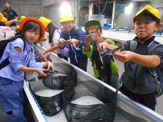 子どもたちは、港で本物の漁船を前にドキドキワクワクしていました。船の操縦席やエンジンを見せてもらった後は、いよいよ海へ出発です。波の上を進む船の揺れや風の強さなど、教室では感じられないことをたくさん体験しました。