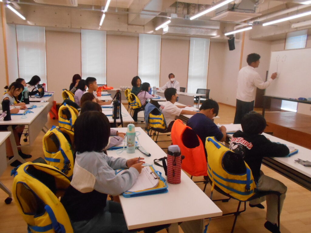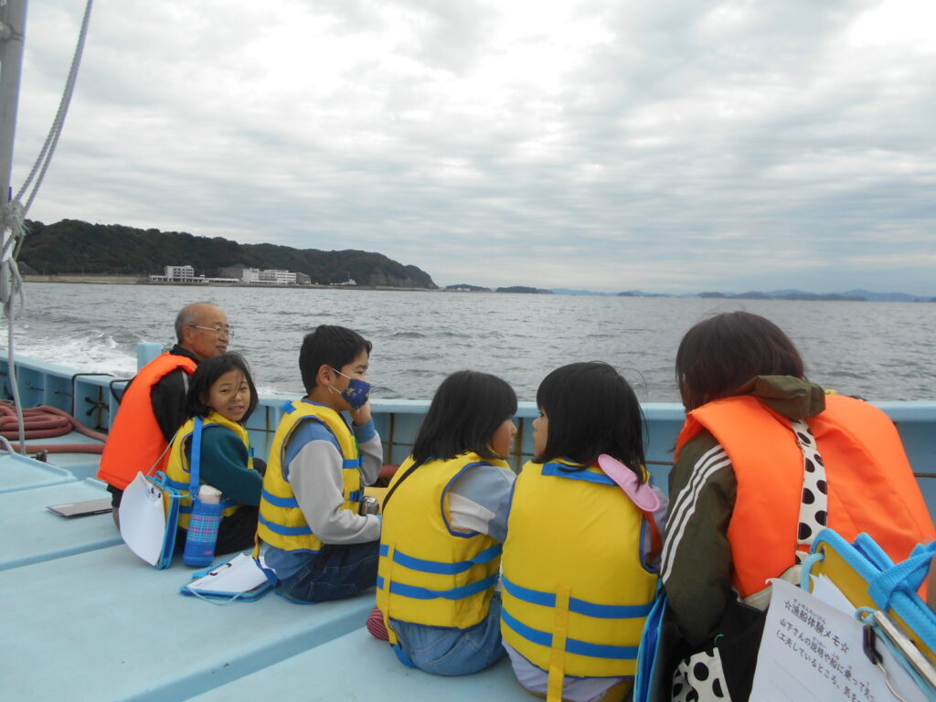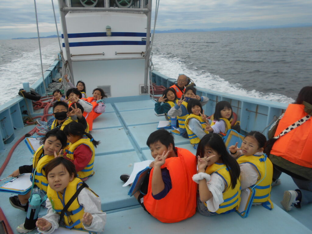 子どもたちは、港で本物の漁船を前にドキドキワクワクしていました。船の操縦席やエンジンを見せてもらった後は、いよいよ海へ出発です。波の上を進む船の揺れや風の強さなど、教室では感じられないことをたくさん体験しました。