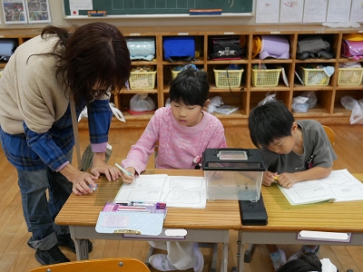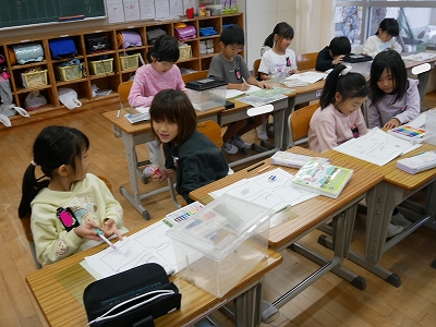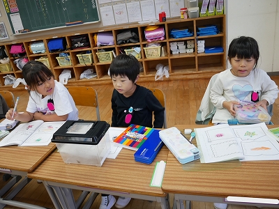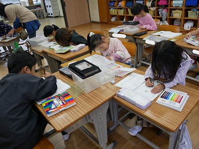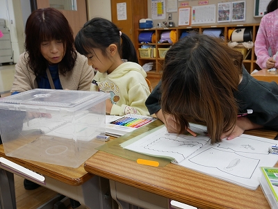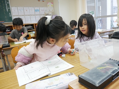 1年生は、国語の時間に学校で見つけた生き物や生き物の写真をよく見て、絵を描いていました。そして、その生き物に名前をつけていました。