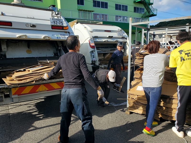 今年度2回目のPTA資源回収を行いました。地元企業の皆様やPTA役員、委員、会員の皆さんにご協力いただいて集めた段ボールをパッカー車に積み込みました。PTAの皆さんが手際よく動いてくださり、1時間ほどで作業は終了しました。この収益はPTAの予算として、PTA活動や児童のために有効に活用させていただきます。ご協力くださった皆様、ありがとうございました。