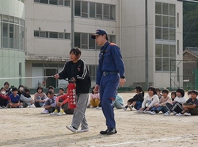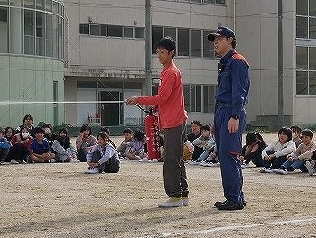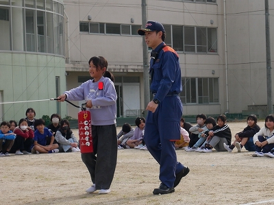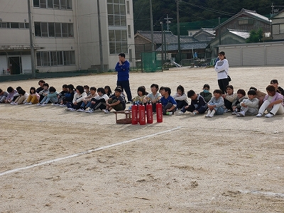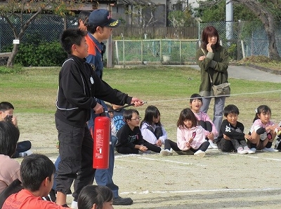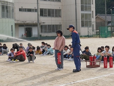 運動場で人員確認をした後は、知多南部消防組合の方から消火器の使い方を教えてもらい、代表児童が水消火器を使って消火器体験をしました。