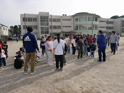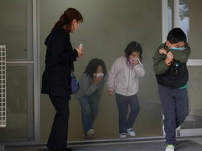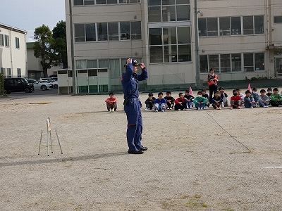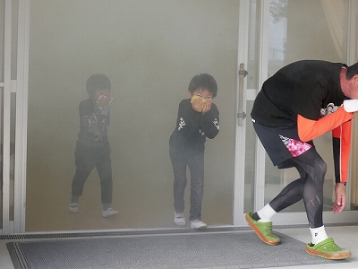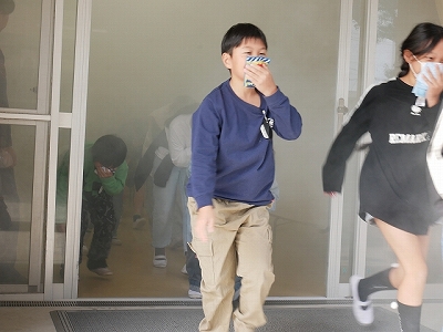 5時間目に火災避難訓練を行いました。家庭科室から出火したという想定で、火災報知器が鳴ると、緊急放送の指示を聞いて教室から運動場へ素早く避難しました。1,3,5年生は、スモークマシンで煙を充満させた中を避難する体験もしました。