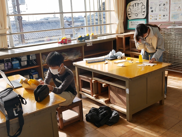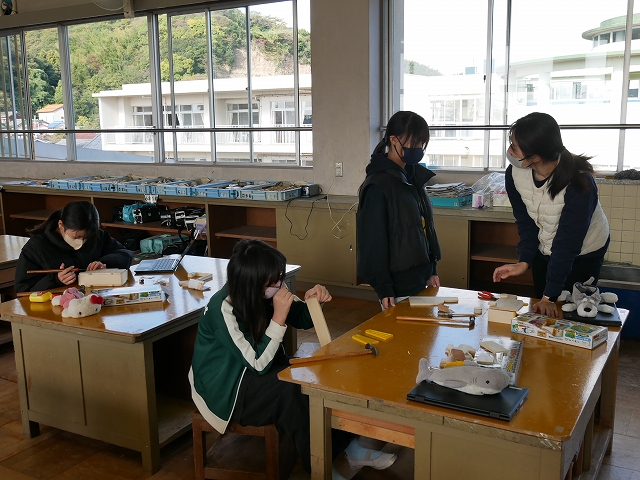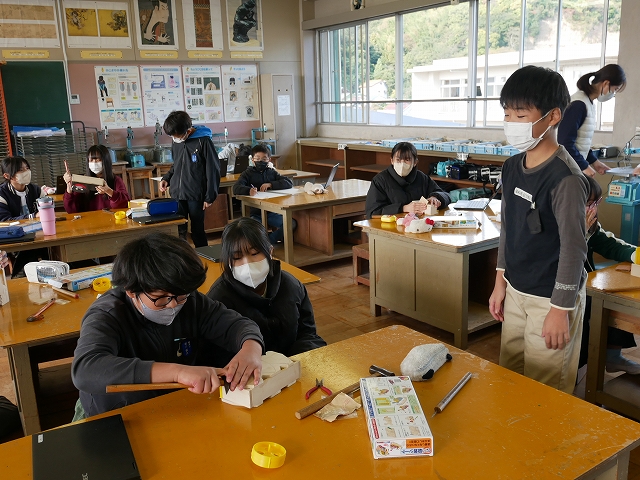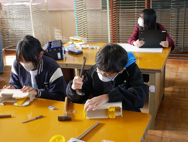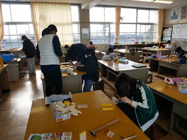 6年 図工 投稿日時: 2025年11月19日 投稿者: 豊浜小学校 令和7年11月19日(水) 1時間目 6年生は、図工の時間にテープカッターの組み立てをしていました。電動糸のこぎりで切断した板やテープホルダーなどのキットの部品を釘で打っていました。完成が近づいているようです。