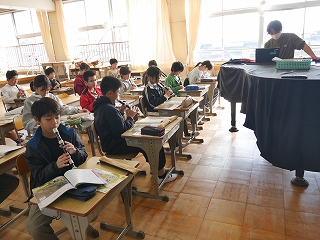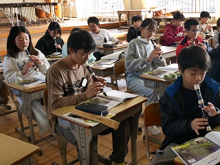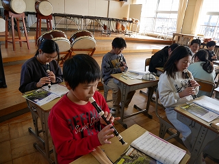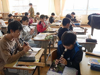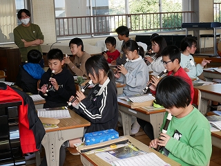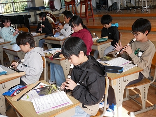 5年 音楽 投稿日時: 2025年12月1日 投稿者: 豊浜小学校 令和7年12月1日(月) 4時間目 5年生は、音楽の時間にリコーダーで「風とケーナのロマンス」という曲の練習をしていました。とてもきれいな音色でした。