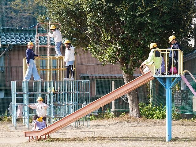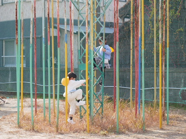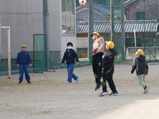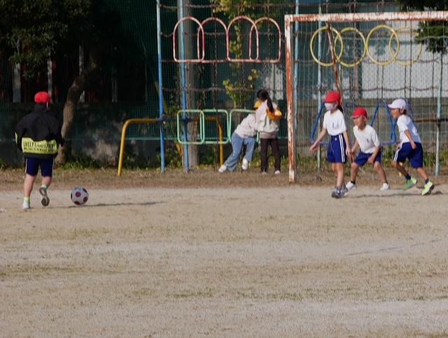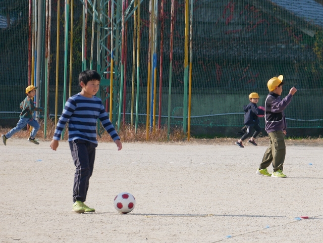 豊浜小学校は、2時間目と3時間目の間の休み時間「大放課」が25分間あります。小春日和の過ごしやすい今日、多くの児童が運動場で元気よく遊んでいました。サッカーやドッジボール、遊具などで、学年や男女問わず一緒に遊ぶ姿もあちらこちらに見られ、小規模校の良さを感じます。