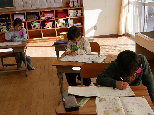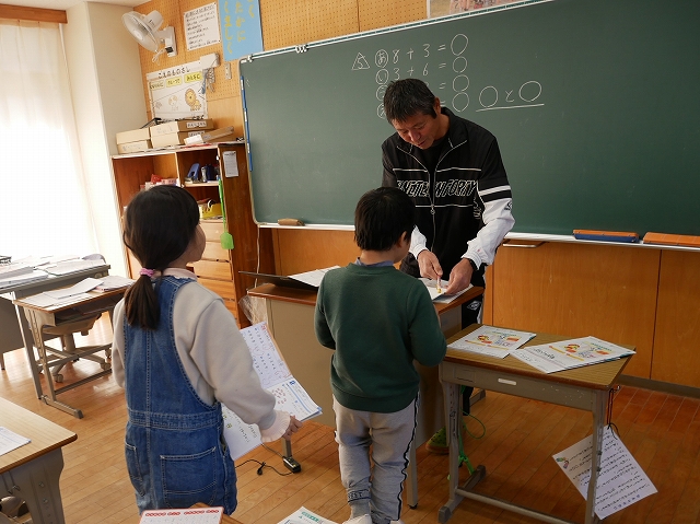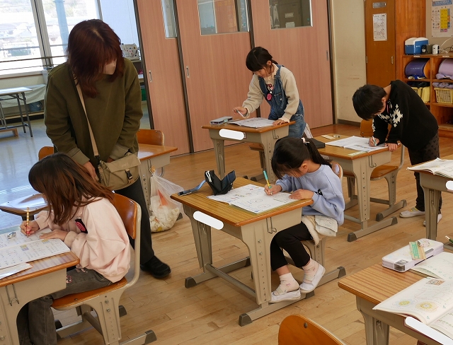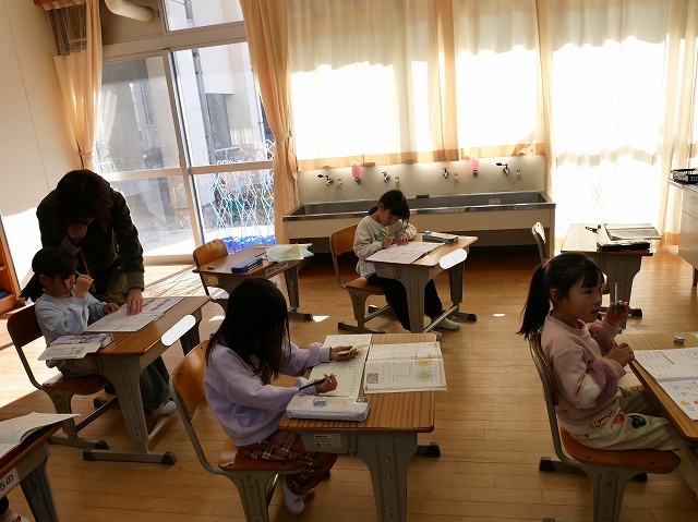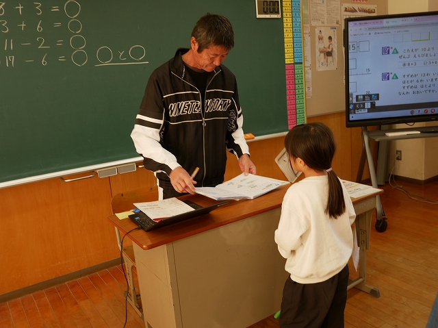 1年生は、算数の時間にこれまでの復習の問題に挑戦していました。先生に見せてマルがもらえると、喜んでいました。