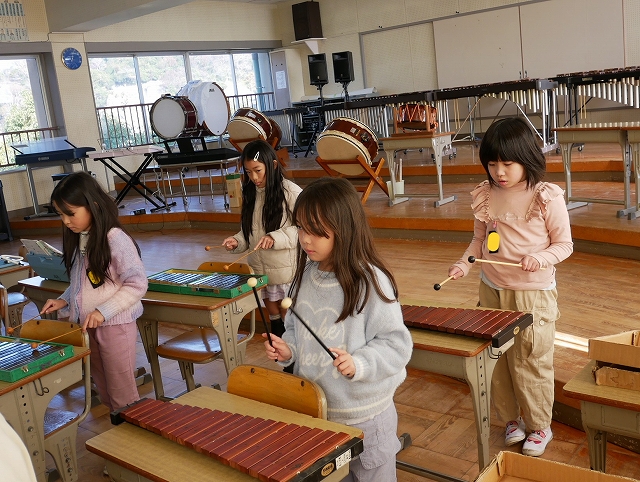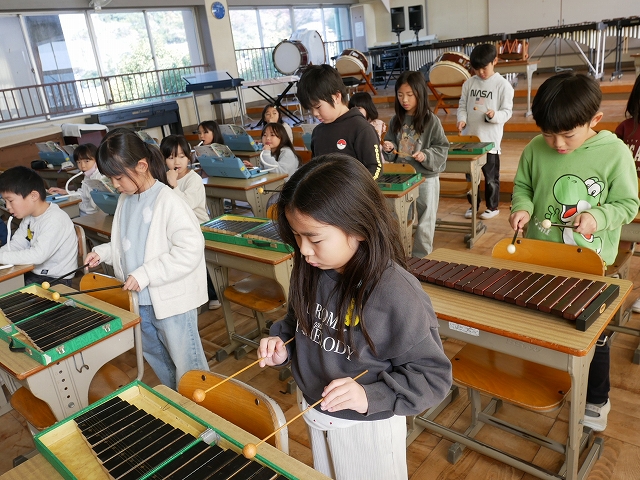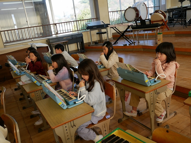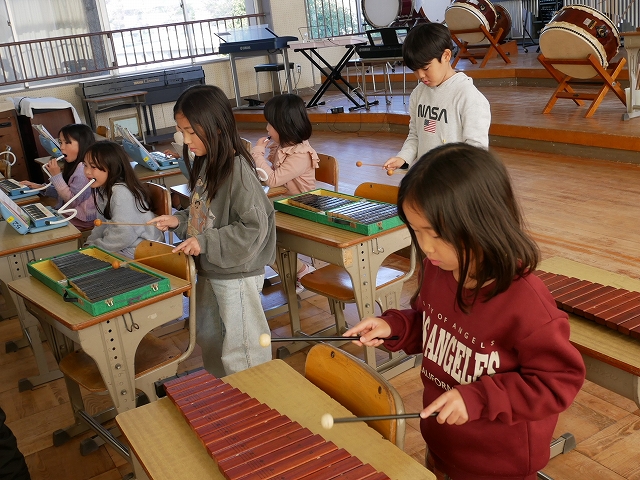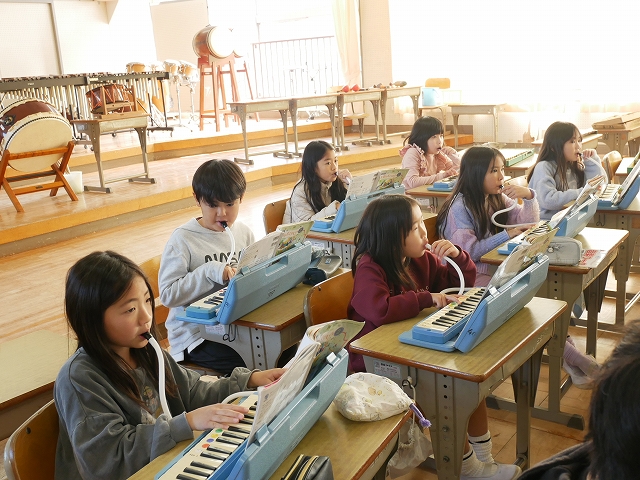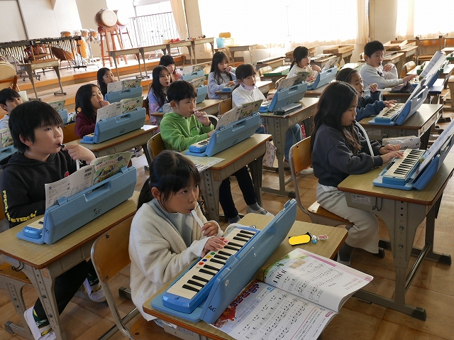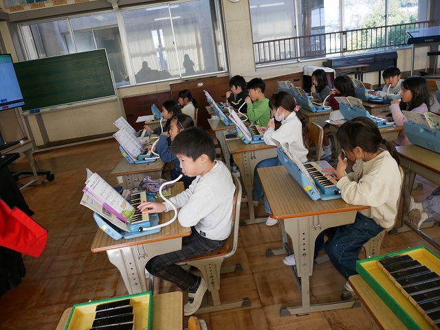 2年 音楽 投稿日時: 2025年12月17日 投稿者: 豊浜小学校 令和7年12月17日(水) 3時間目 2年生は、音楽の時間に「汽車は走る」の鍵盤ハーモニカと木琴のパートの練習をしていました。汽車の「ガッタンゴットン」「シュッシュッポッポ」という音が聞こえてくるようでした。