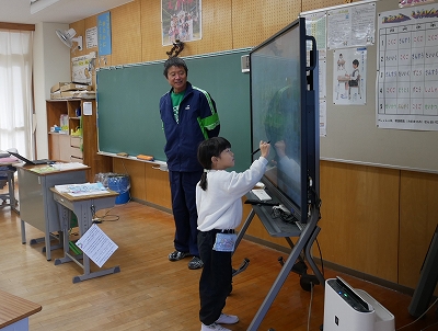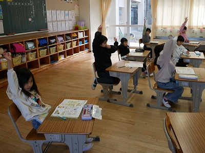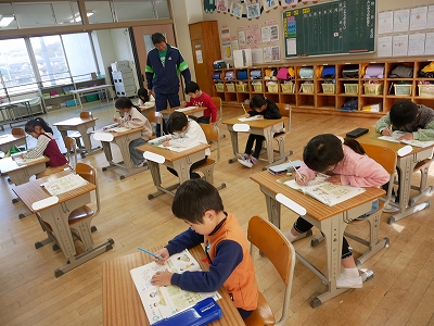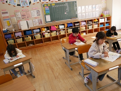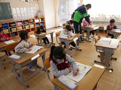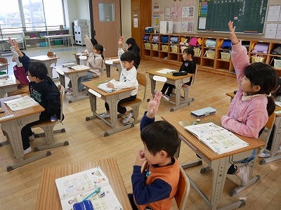 1年生は、算数の時間に「大きいかず」の学習をしていました。たくさんあるものの数を数えるには、10のまとまりを作って、「10がいくつと1がいくつ」で数えます。数えた数を数字とその読み方を平仮名で書いていました。