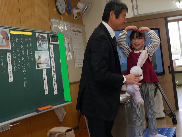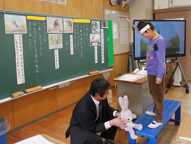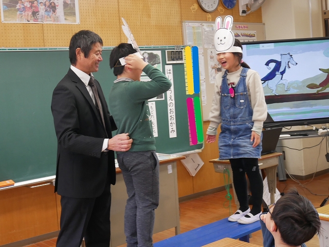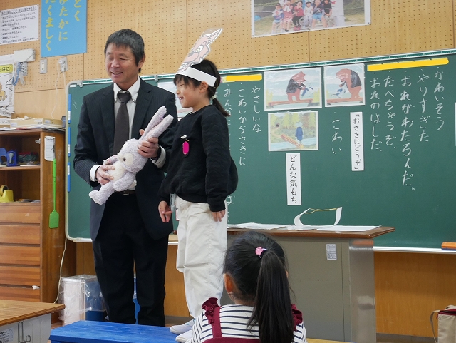 2時間目に、全職員が参観して1年生道徳の研究授業を行いました。「はしのうえのおおかみ」のお話を読んで、親切にすることについて考えました。子どもたちは、積極的に挙手をして、自分の考えを発表してしていました。登場する動物のお面を付けて役割演技をすることで、おおかみの気持ちをより深く考えることができました。親切にすると、された方もした方もいい気持ちですね。