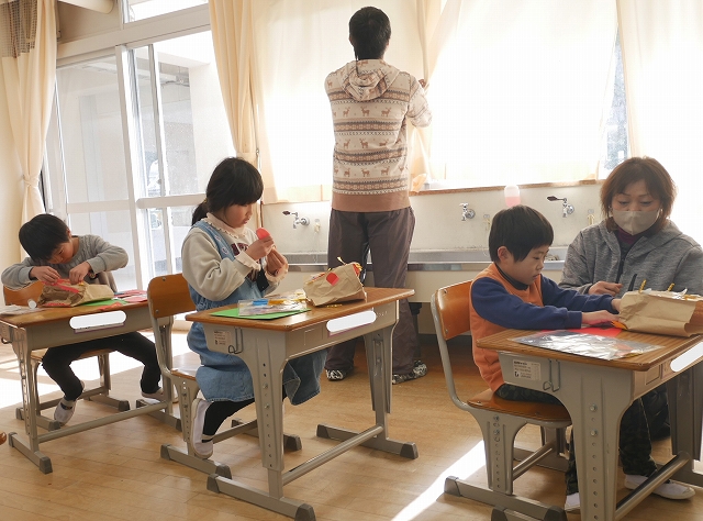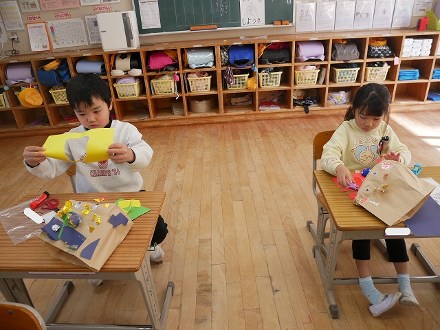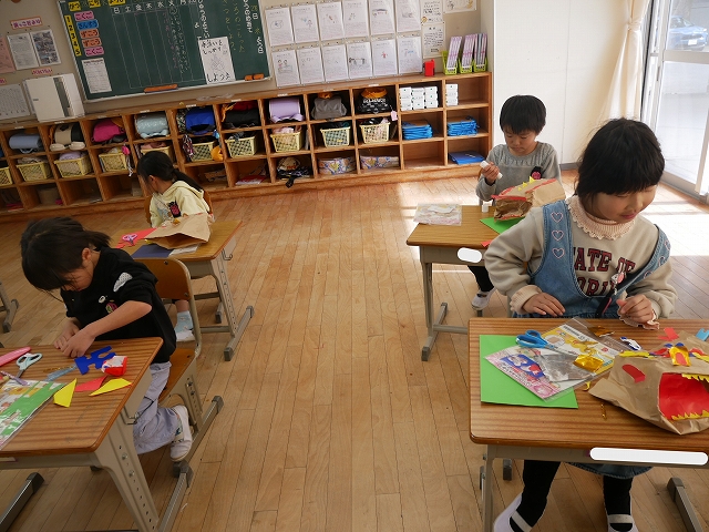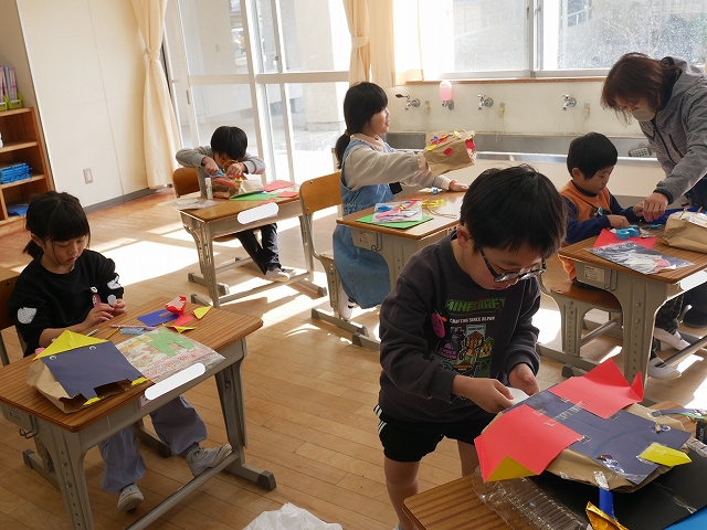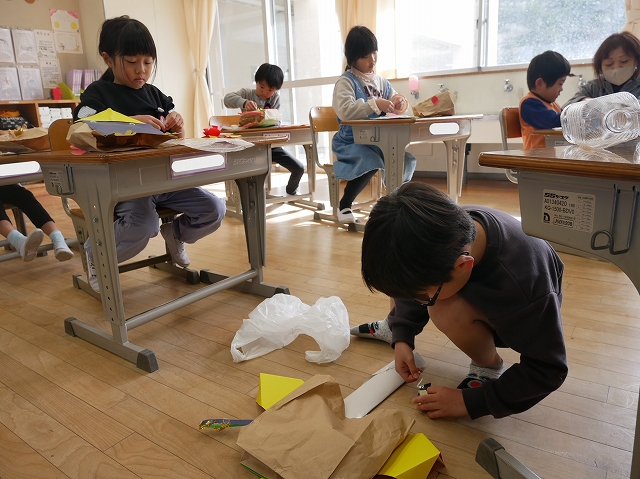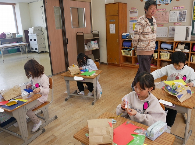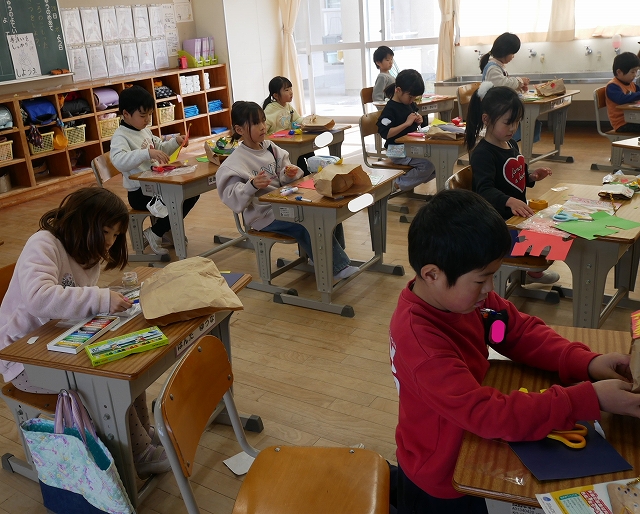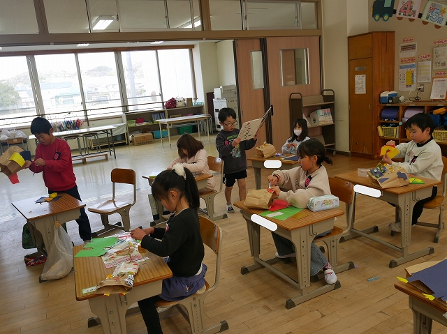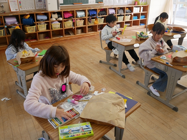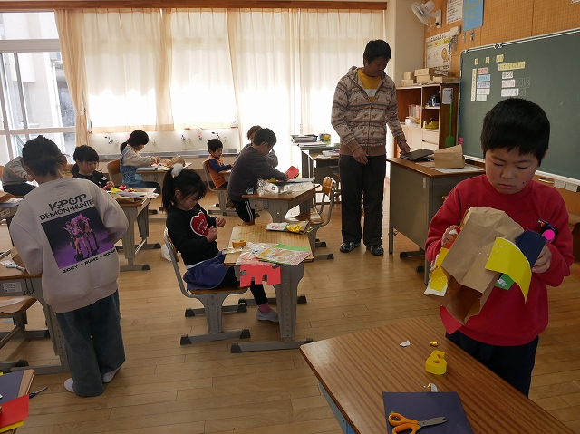 1年 図工 投稿日時: 2026年1月28日 投稿者: 豊浜小学校 令和8年1月28日(水) 3時間目 1年生は、図工の時間に「いっしょにあそぼう ぱくぱっくん」の製作をしていました。紙袋をパクパク動かす大きな口に見立てて顔や手足、飾りなどを付けていました。