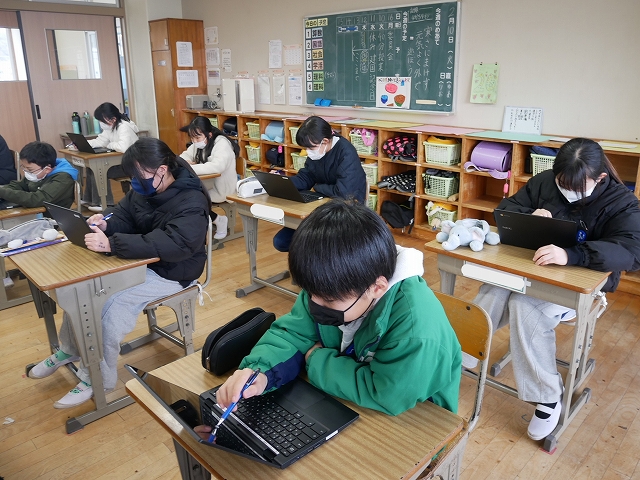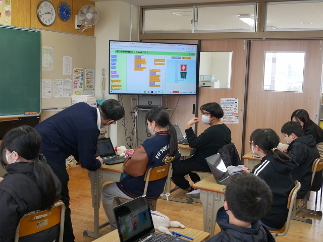 6年生は、情報教育で歩行者用信号機のプログラムを作るという課題に取り組んでいました。ICT支援員さんに教えてもらいながら赤信号や青信号がついたり消えたり、音が鳴ったり止まったりする命令を組み合わせていました。