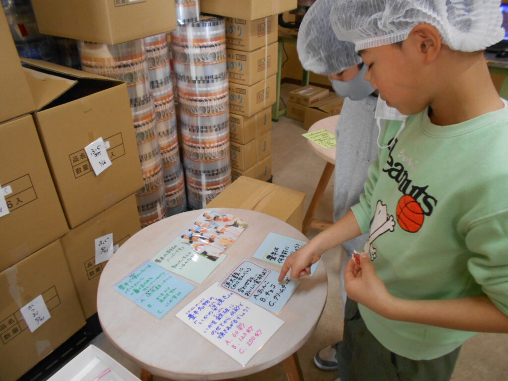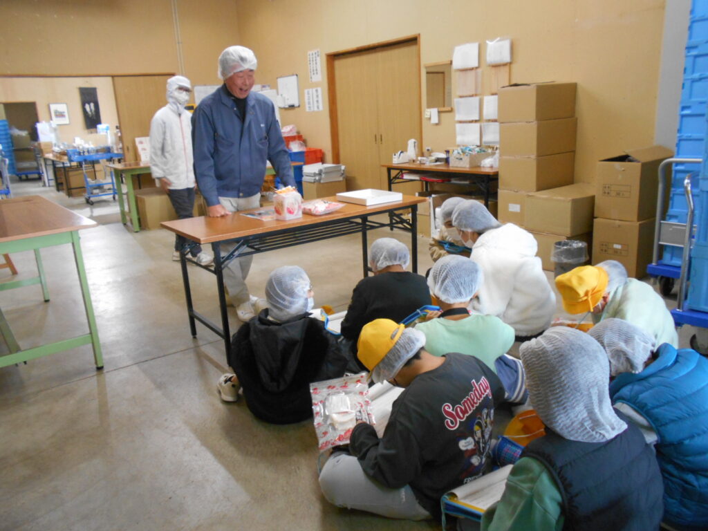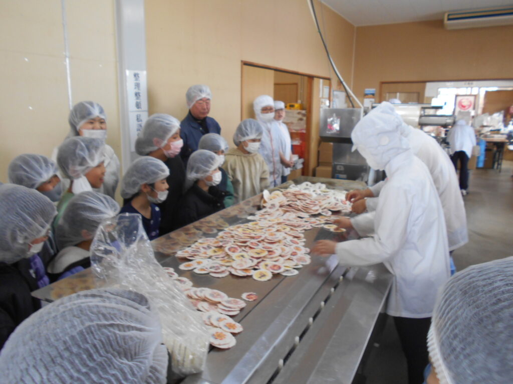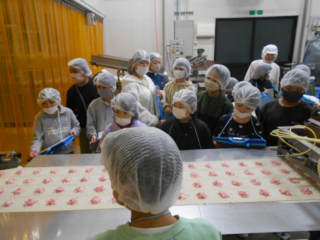子どもたちは、おせんべいの原料や、できあがるまでの工程を実際に見せていただき、興味津々の様子でした。説明を聞きながら、一生懸命見学メモに書きとめる姿がとても印象的でした。また、気になったことを自分から進んで質問することもできました。