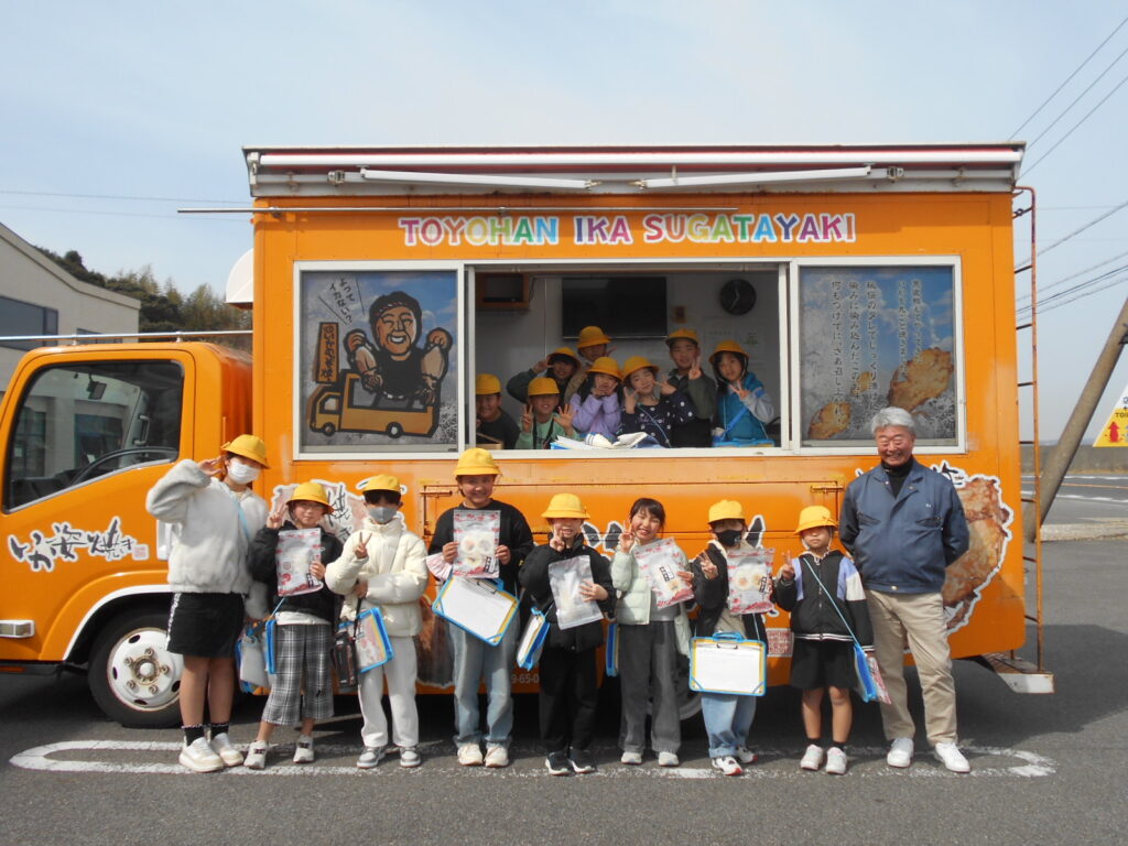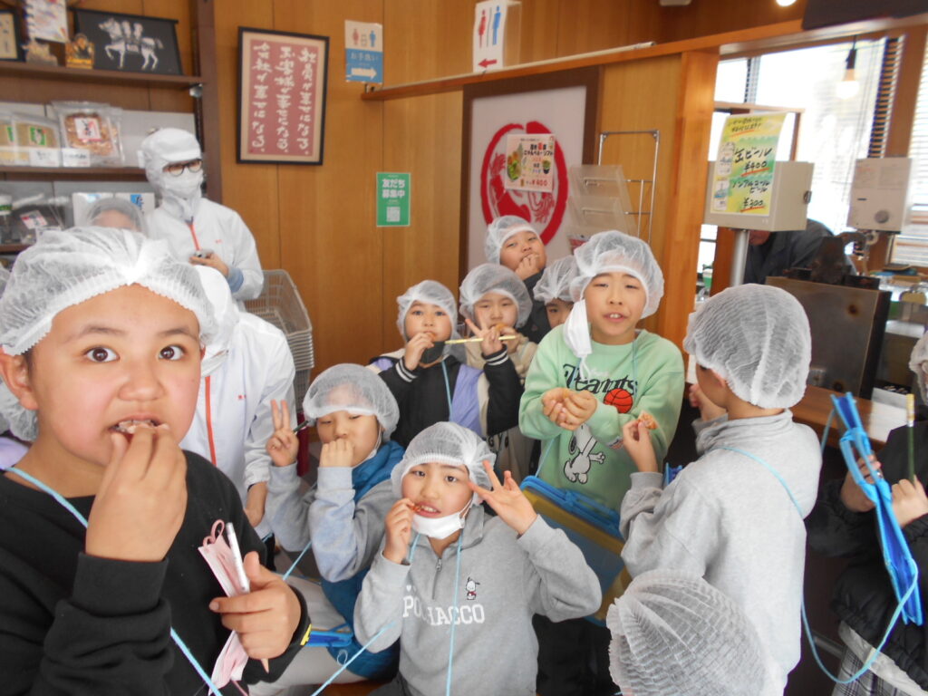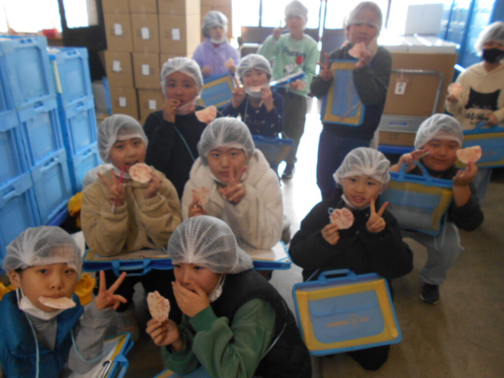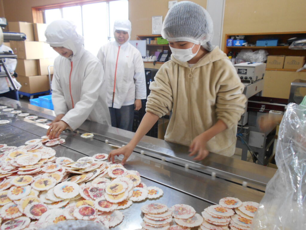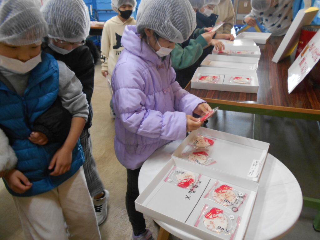 見学では、おせんべいをレーンに並べる体験や、できたてのおせんべいやいかの姿焼きも試食させていただき、子どもたちは大喜びでした。