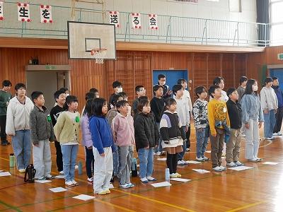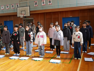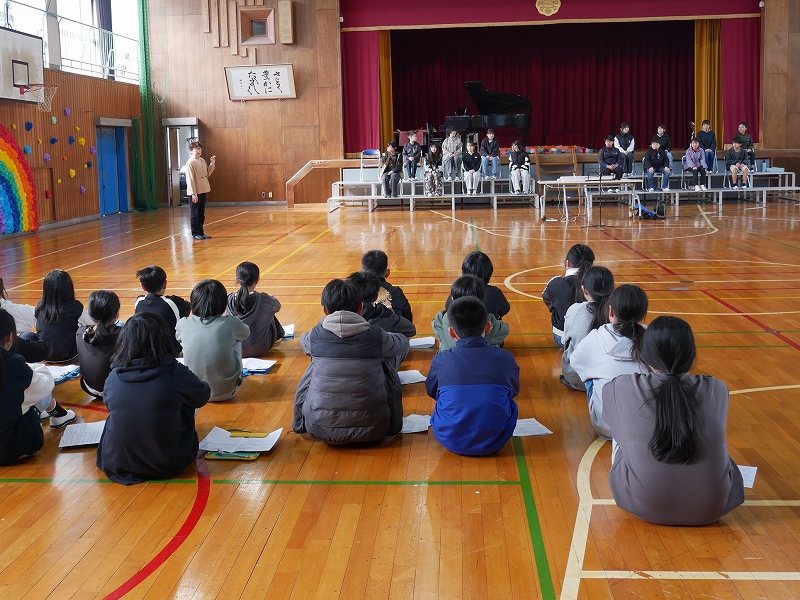 2時間目は、卒業式に参加する3~6年生で、「君が代」「スマイルアゲイン」「校歌」の練習をしました。どの学年も良い態度で臨み、一生懸命歌っていました。ブレスのタイミングや細かい音程などの指導を受けて、さらに美しい歌声になりました。