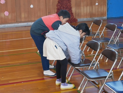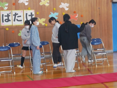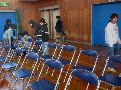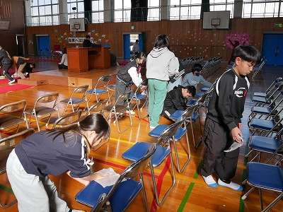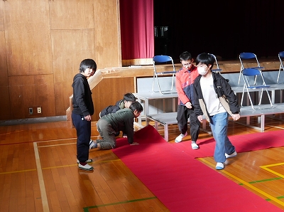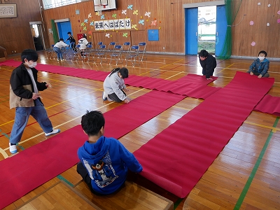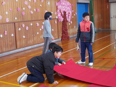 1時間目に、4年生と5年生が卒業式の式場づくりをしてくれました。主に4年生が椅子並べ、5年生が赤絨毯敷きを担いました。協力して手際よく作業を進め、予定より早く終わることができました。