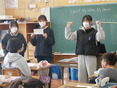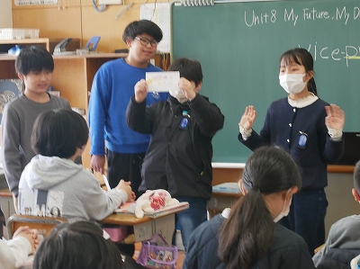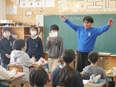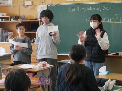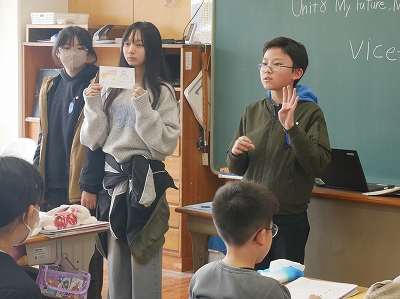 6年生は、外国語の時間に英語のスピーチをしました。これまでに学習した自己紹介(自分の名前)、好きなこと、宝物、行きたい国、なりたい職業など10の英文をすべて覚え、ジェスチャーをつけてにこやかに発表しました。皆、とても上手に発表していました。