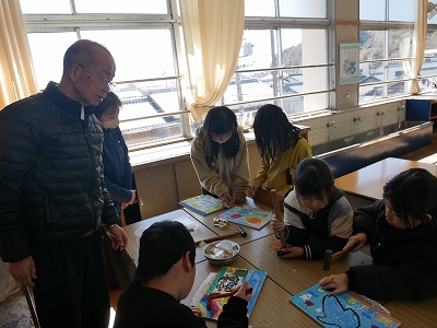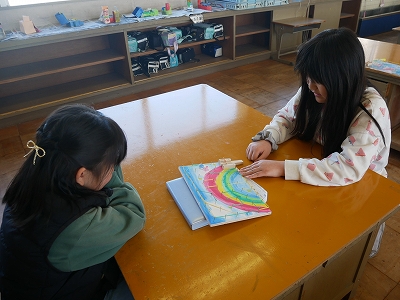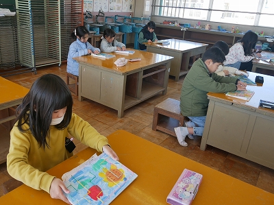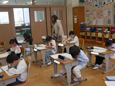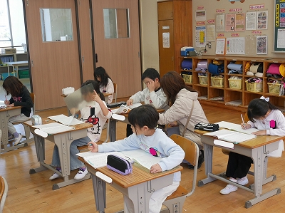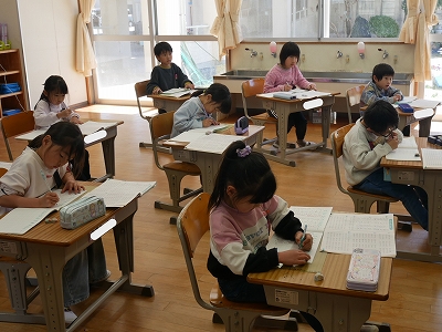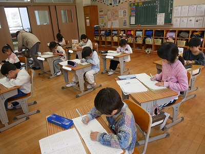 1年生は、算数の時間に一年間の復習の計算問題に取り組んでいました。教科書の「けいさんのれんしゅう」のページにあるたくさんの計算練習問題をノートに写し、解いていました。黙々と問題に取り組む姿にこの1年の成長を感じます。