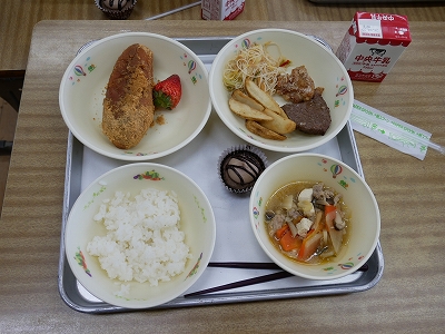 今日は、6年生のお祝い給食でした。メニューは、ご飯、牛乳、知多牛のステーキ、鶏の唐揚げ、フライドポテト、ピリ辛スープ、ビーフン入り野菜炒め、きなこ揚げパン、カップケーキ、いちごです。6年生は、いつも以上に豪華な給食に大喜びです。お世話になった先生も一緒に食べました。また、給食の準備や片付けでお世話になった用務員さん、給食配膳員さんにはお礼のメッセージをプレゼントしました。