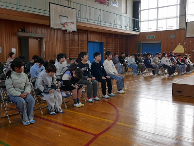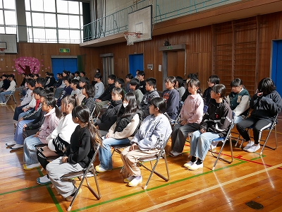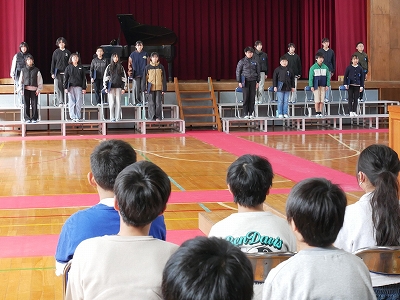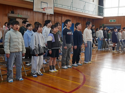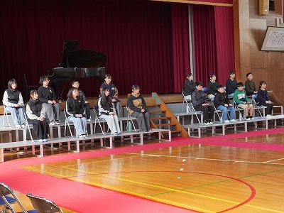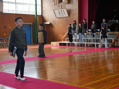 1,2時間目に卒業式の予行練習を行いました。あさっての卒業式と同じように卒業生入場から退場までを通して練習しました。卒業生も在校生も真剣な表情で練習に参加しました。呼びかけや歌もとても上手に行うことができました。