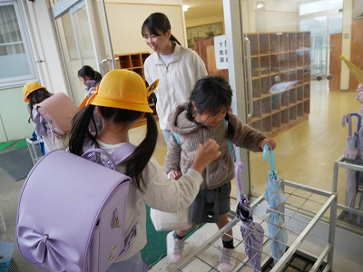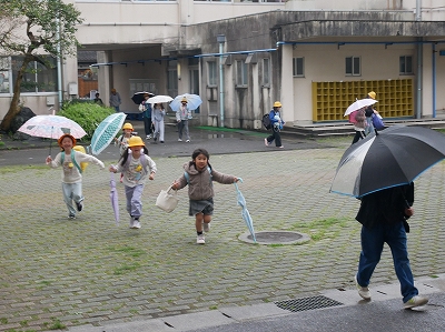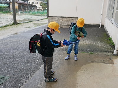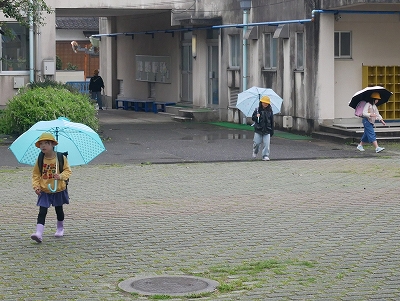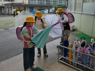 始業式翌日の今日、雨が降る中の登校となりましたが、上手に班登校ができたようです。昇降口では、1年生も傘をまとめて傘立てに入れることができました。「靴下が濡れた」という子もいましたが、ちゃんと替えの靴下をもってきたそうです。