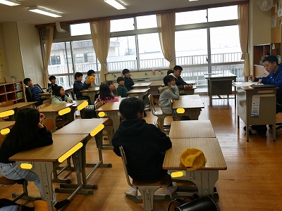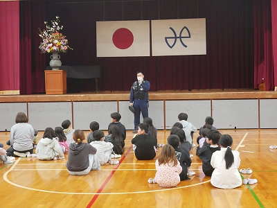 その後、学校の周りの道路を使って歩行訓練をする予定でしたが、雨が強く降っていたため、体育館で駐在さんによる交通講話を聞きました。