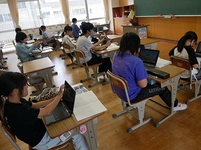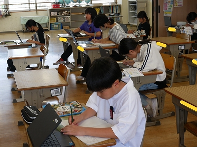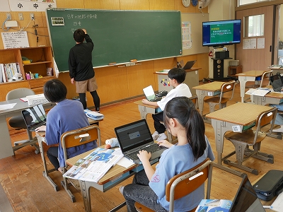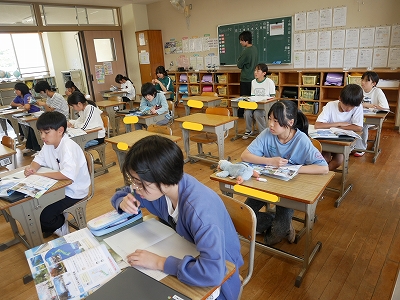 5年生は、社会の時間に「日本の地形や気候」という単元の学習の進め方を確認していました。学習問題に対して、教科書や資料集、タブレット端末などを使って調べ、自分なりの答えを見つけていけるといいですね。